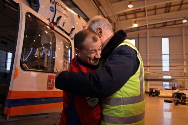 На аэродроме Остафьево состоялась трогательная встреча — лучший пилот-спасатель Москвы, командир санитарного вертолета Московского авиационного центра Юрий Лебедев встретился с человеком, которому вместе с авиамедицинской бригадой спас жизнь.
